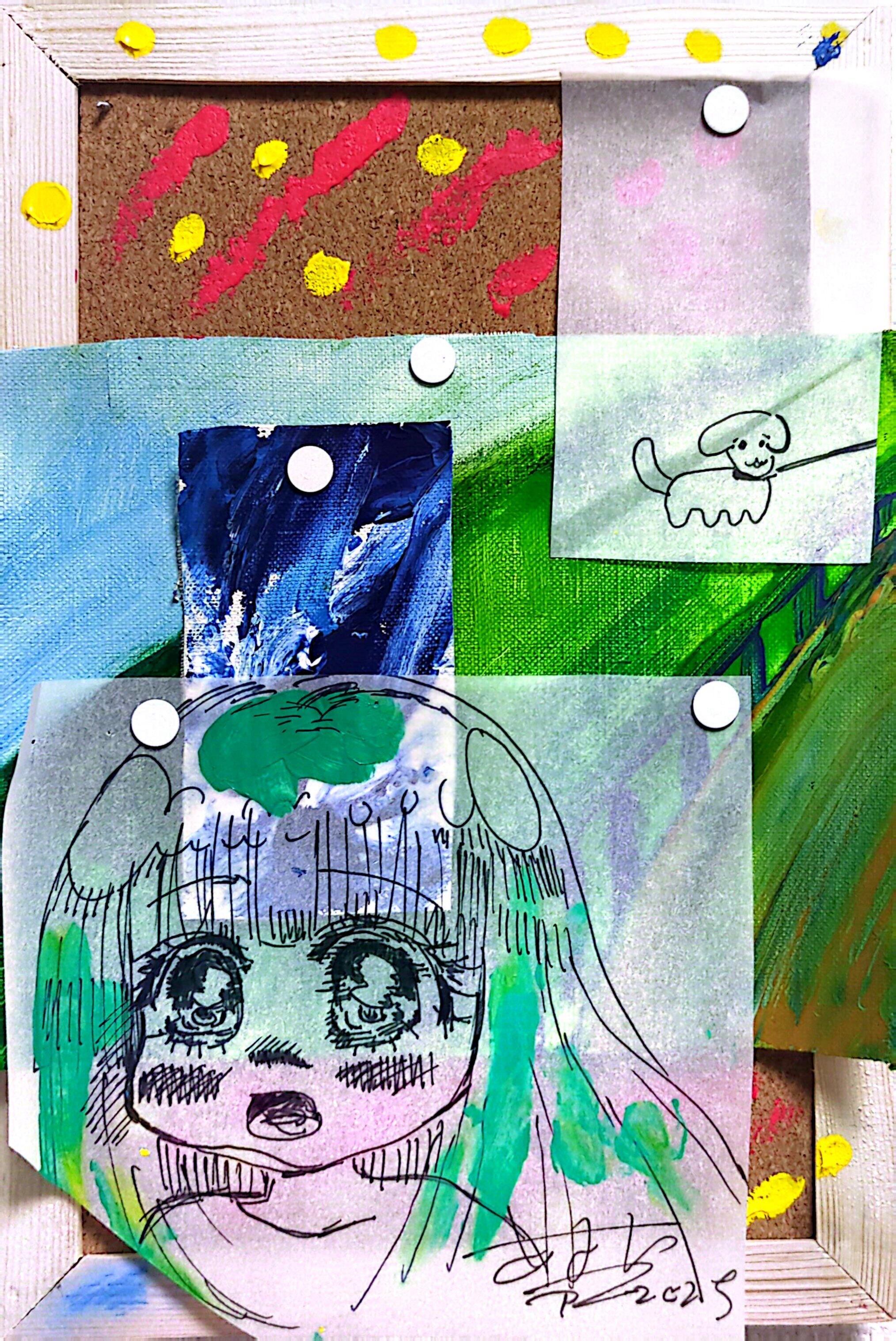 これは私の記憶ではないが、ずっとここにあった気がする、どこかで見慣れてような風景だ。本作は、なかったがあったような記憶の断片をコラージュとして構成したインスタレーション的絵画作品である。絵の具や紙、手描きのドローイングは、「記憶の断片性」や「感情の多層性」を表している。画鋲というメディアを用いることで、「留められるが、剥がされる可能性もある」不確かな記憶の在り方を暗示している。